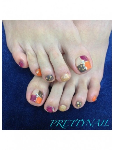 秋色カラーブロック 星柄フットネイル 池袋のネイルサロン ネイルスクール Prettynail プリティーネイル